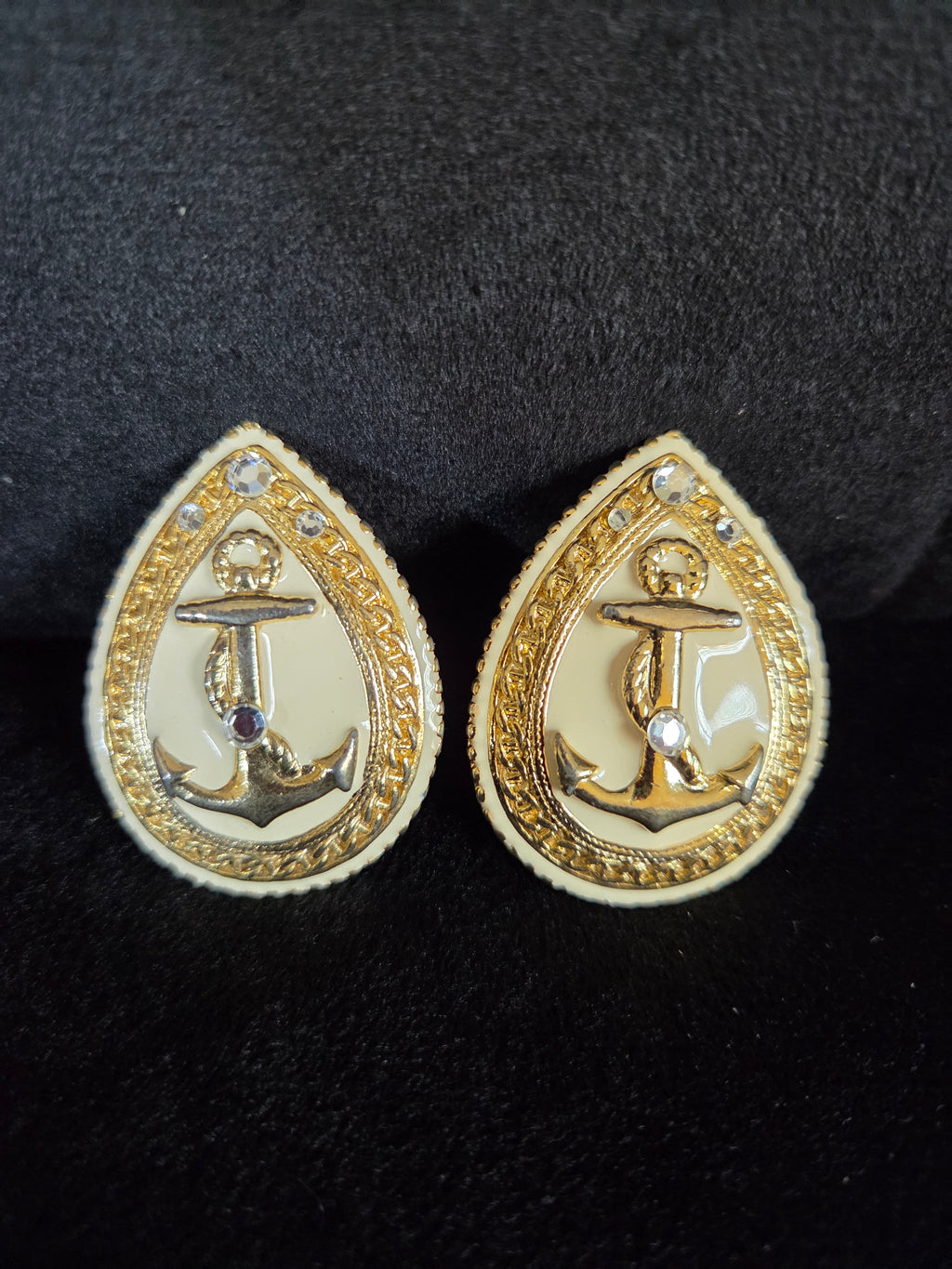 Vintage Anchor Goldtone and Cream Clip On Earrings